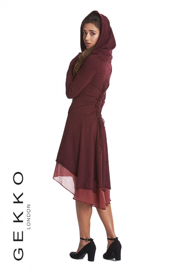 Cotton lycra mid dress with longer back, large neck and ribbed leaves